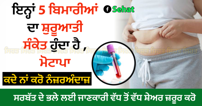 ਮੋਟਾਪਾ ਵਧਣ ਨਾਲ ਸਰੀਰ ਵਿਚ ਕਈ ਬੀਮਾਰੀਆਂ ਹੋਣ ਦੀ ਸੰਭਾਵਨਾ ਵਧ ਜਾਂਦੀ ਹੈ । ਕਈ ਵਾਰ ਮੋਟਾਪਾ ਸਰੀਰ ਵਿੱਚ ਬਿਮਾਰੀਆਂ ਦੀ ਸ਼ੁਰੁਆਤੀ ਵਜ੍ਹਾ ਬਣ ਜਾਂਦਾ ਹੈ । ਡਾਇਬਿਟੀਜ਼ ਤੋਂ ਲੈ ਕੇ ਹਾਰਟ ਰੋਗ ਤੱਕ ਵਧਣ ਦਾ ਕਾਰਨ ਮੋਟਾਪਾ ਹੋ ਸਕਦੇ ਹਨ । ਮੋਟਾਪਾ ਸਰੀਰ ਦੇ ਮਾਨਸਿਕ ਅਤੇ ਸਰੀਰਿਕ ਸਿਹਤ ਤੇ ਅਸਰ ਪਾਉਂਦਾ ਹੈ । ਮੋਟਾਪਾ ਰਹਿਣ ਦੀ ਵਜ੍ਹਾ ਨਾਲ ਕਈ ਵਾਰ ਰੋਜ਼ਮੱਰਾ ਦੇ ਕੰਮ ਕਰਨ ਵਿੱਚ ਵੀ ਤਕਲੀਫ਼ ਹੁੰਦੀ ਹੈ । ਕਈ ਵਾਰ ਸਰੀਰ ਦਾ ਮੋਟਾਪਾ ਵਧਣ ਦੇ ਕਾਰਨ ਵਿਅਕਤੀ ਮਾਨਸਿਕ ਰੂਪ ਨਾਲ ਵੀ ਪ੍ਰੇਸ਼ਾਨ ਰਹਿਣ ਲੱਗਦਾ ਹੈ , ਇਸ ਵਿਚ ਮੋਟਾਪੇ ਨੂੰ ਕੰਟਰੋਲ ਕਰਨਾ ਸਭ ਤੋਂ ਜ਼ਰੂਰੀ ਹੁੰਦਾ ਹੈ । ਤੁਸੀਂ ਹੈਲਦੀ ਡਾਈਟ ਅਤੇ ਐਕਸਰਸਾਈਜ਼ ਦੀ ਮਦਦ ਨਾਲ ਮੋਟਾਪੇ ਨੂੰ ਕੰਟਰੋਲ ਕਰ ਸਕਦੇ ਹੋ ।ਅੱਜ ਅਸੀਂ ਤੁਹਾਨੂੰ ਦੱਸਾਂਗੇ , ਕਿ ਸਰੀਰ ਵਿਚ ਮੋਟਾਪਾ ਵਧਣ ਦੇ ਕਾਰਨ ਕਿਹੜੀਆਂ ਬੀਮਾਰੀਆਂ ਹੋਣ ਦੀ ਸੰਭਾਵਨਾ ਵਧ ਜਾਂਦੀ ਹੈ ।ਜਾਣੋ ਮੋਟਾਪੇ ਦੇ ਕਾਰਨ ਹੋਣ ਵਾਲੀਆਂ ਬਿਮਾਰੀਆਂ