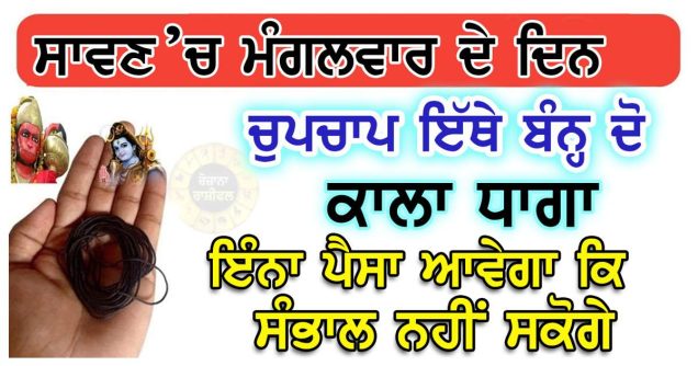 ਅੱਜ ਅਸੀਂ ਤੁਹਾਨੂੰ ਬੜੀ ਖਾਸ ਜਾਣਕਾਰੀ ਦੇਣ ਜਾ ਰਹੇ ਹਾਂ ਜਿਸ ਵਿਚ ਅਸੀਂ ਤੁਹਾਨੂੰ ਦਸਾਂਗੇ ਸਾਵਣ ਦੇ ਮੰਗਲਵਾਰ ਨੂੰ ਜੇਕਰ ਤੁਸੀ ਖਾਸ ਜਗ੍ਹਾ ਕਾਲ਼ਾ ਧਾਗਾ ਬੰਨ੍ਹਦੇ ਹੋ ਤਾ ਤੁਹਾਡੇ ਘਰ ਇੰਨਾ ਪੈਸਾ ਆਵੇਗਾ ਕਿ ਤੁਸੀ ਸੰਭਾਲ ਨਹੀਂ ਸਕੋਗੇ । ਦੋਸਤੋ ਕਲਾ ਧਾਗਾ ਬੰਨਣ ਦੀ ਪ੍ਰਥਾ ਅੱਜ ਦੀਆਂ ਨਹੀਂ ਹੈ, ਕਈ ਸਾਲਾਂ ਤੋਂ ਇਸਨੂੰ ਹੱਥ, ਪੈਰ, ਗਲੇ ਅਤੇ ਬਾਂਹ ਤੇ ਬੰਨਿਆ ਜਾਂਦਾ ਰਿਹਾ ਹੈ । ਮੂਲ ਰੂਪ ਤੋਂ ਇਸਨੂੰ ਨਜ਼ਰ ਤੋਂ ਬਚਨ ਲਈ ਬੰਨਿਆ ਜਾਂਦਾ ਹੈ . . ਆਓ ਜੀ ਜਾਣੋ ਇਸਦੇ ਵਿਸ਼ਾ ਵਿੱਚ ਵਿਸਥਾਰ ਨਾਲ . . .
