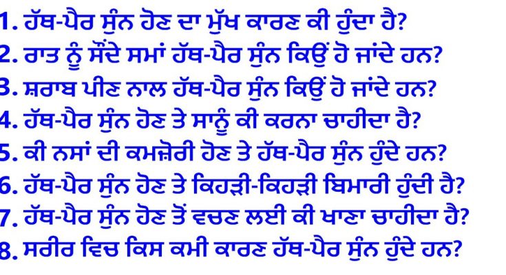 ਇਹ ਸਮੱਸਿਆ ਰਾਤ ਨੂੰ ਸੌਣ ਲੱਗਿਆਂ ਹੁੰਦੀ ਹੈ ਕਈ ਲੋਕ ਕੀ ਕਰਦੇ ਹਨ ਆਪਣੀ ਹੱਥਾਂ ਨੂੰ ਸਿਰ ਦੇ ਥੱਲੇ ਦੇ ਕੇ ਸੌਂ ਜਾਂਦੇ ਹਨ ਜਿਸ ਨਾਲ ਲੰਮੇ ਸਮੇਂ ਤਕ ਭਾਰ ਪੈਣ ਕਾਰਨ ਹੱਥਾਂ ਵਿੱਚ ਖ਼ੂਨ ਦਾ ਸਰਕਲ ਰੁਕ ਜਾਂਦਾ ਹੈ ਜਿਸ ਨਾਲ ਹੱਥ ਸੁੰਨ ਹੋ ਜਾਂਦੇ ਹਨ ਇਸ ਲਈ ਕਦੀ ਵੀ ਇੱਕੋ ਹੀ ਪੁਜੀਸ਼ਨ ਵਿਚ ਨਾ ਸੌਂਵੋ।ਹੱਥ ਪੈਰ ਸੁੰਨ ਹੋਣ ਤੇ ਸਾਨੂੰ ਕਿਹੜੀਆਂ ਬੀਮਾਰੀਆਂ ਹੋ ਸਕਦੀਆਂ ਹਨ?ਇਸ ਨਾਲ ਸਾਨੂੰ ਡਾਈਬੀਟੀਜ਼,ਹੱਥਾਂ ਪੈਰਾਂ ਵਿੱਚ ਅਕੜਨ ਰਹਿੰਦੀ ਹੈ ਜਿਸ ਨਾਲ ਸਾਨੂੰ ਥਾਇਰਾਇਡ ਦੀ ਬੀਮਾਰੀ ਹੋ
