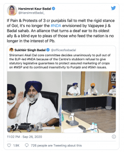 ਹਰਸਿਮਰਤ ਬਾਦਲ ਨੇ ਕਿਹਾ ‘ਇਹ ਉਹ ਐਨਡੀਏ ਨਹੀਂ ਜਿਸਦੀ ਕਲਪਨਾ ਅਟਲ ਬਿਹਾਰੀ ਵਾਜਪਾਈ ਤੇ ਪ੍ਰਕਾਸ਼ ਸਿੰਘ ਬਾਦਲ ਨੇ ਕੀਤੀ ਸੀ।’ਹਰਸਮਿਰਤ ਨੇ ਟਵੀਟ ਕੀਤਾ, ‘ਜੇਕਰ ਤਿੰਨ ਕਰੋੜ ਪੰਜਾਬੀਆਂ ਦੇ ਦਰਦ ਅਤੇ ਵਿਰੋਧ ਦੇ ਬਾਵਜੂਦ ਭਾਰਤ ਸਰਕਾਰ ਦਾ ਦਿਲ ਨਹੀਂ ਪਸੀਜ ਰਿਹਾ ਤਾਂ ਇਹ ਉਹ ਐਨਡੀਏ ਨਹੀਂ ਜਿਸ ਦੀ ਕਲਪਨਾ ਅਟਲ ਬਿਹਾਰੀ ਵਾਜਪਾਈ ਅਤੇ ਪ੍ਰਕਾਸ਼ ਸਿੰਘ ਬਾਦਲ ਨੇ ਕੀਤੀ ਸੀ।