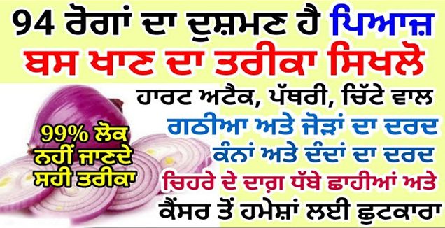ਰੋ-ਗਾਂ ਨਾਲ ਲ-ੜ-ਨ ਦੀ ਸ਼ਕਤੀ ਵਧ ਜਾਂਦੀ ਹੈ, ਇਹ ਪੇਟ ਦੀਆਂ ਬਿ-ਮਾ-ਰੀ-ਆਂ ਪੈਦਾ ਨਹੀਂ ਹੋਣ ਦਿੰਦਾ,ਕਬਜ਼ ਵਰਗੀਆਂ ਕੈਂ-ਸ-ਰ ਵਰਗੀਆਂ ਸ-ਮੱ-ਸਿ-ਆ-ਵਾਂ ਪੈਦਾ ਨਹੀਂ, ਇਸ ਨਾਲ ਤੁਹਾਡੇ ਮੂੰਹ ਵਿਚ ਬੈ-ਕ-ਟੀ-ਰੀ-ਆ ਨਹੀਂ ਬਣਦੇ ਤੁਹਾਡੇ ਦੰਦ ਮ-ਜ਼-ਬੂ-ਤ ਰਹਿੰਦੇ ਹਨ ਇਸ ਪ੍ਰਕਾਰ ਤੁਸੀਂ ਕੱਚਾ ਪਿਆਜ਼ ਦੀ ਸੇਵਨ ਕਰਿਆ ਕਰਦਾ ਹੈ ਇਸ ਜਾਣਕਾਰੀ ਨੂੰ ਵੱਧ ਤੋਂ ਵੱਧ ਲੋਕਾਂ ਤੱਕ ਪਹੁੰਚਾਉਣ ਤਾਂ ਜੋ ਕਿਸੇ ਦਾ ਭਲਾ ਹੋ ਸਕੇ.