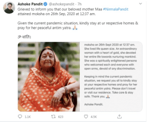 ਅਜਿਹੀ ਹੀ ਇੱਕ ਮਾੜੀ ਖਬਰ ਹੁਣ ਫਿਰ ਬੋਲੀਵੁਡ ਜਗਤ ਤੋਂ ਆ ਰਹੀ ਹੈ ਜਿਸ ਨਾਲ ਬੋਲੀਵੁਡ ਵਿਚ ਫਿਰ ਸੋਗ ਦੀ ਲਹਿਰ ਦੌੜ ਗਈ ਹੈ।ਪਿਛਲੇ ਕਈ ਦਿਨਾਂ ਤੋਂ ਬਾਲੀਵੁੱਡ ਇੰਡਸਟਰੀ ਤੋਂ ਬੁਰੀ ਖ਼ਬਰਾਂ ਆ ਰਹੀਆਂ ਹਨ, ਜਿਸ ਕਾਰਨ ਪ੍ਰਸ਼ੰਸਕ ਦੁੱਖਾਂ ਤੋਂ ਦੂਰ ਨਹੀਂ ਹੋ ਪਾ ਰਹੇ। ਪਿਛਲੇ ਸ਼ੁੱਕਰਵਾਰ, ਮਸ਼ਹੂਰ ਗਾਇਕ ਐਸ ਪੀ ਬਾਲਾ ਸੁਬਰਾਮਣੀਅਮਦੀ ਮੌਤ ਹੋ ਗਈ , ਜਿਸ ਨਾਲ ਪ੍ਰਸ਼ੰਸਕਾਂ ਨੂੰ ਵੱਡਾ ਝਟਕਾ ਲੱਗਾ। ਹੁਣ ਇੱਕ ਹੋਰ ਵੱਡੀ ਖਬਰ ਆ ਰਹੀ ਹੈ ਕੇ ਮਸ਼ਹੂਰ ਨਿਰਮਾਤਾ-ਨਿਰਦੇਸ਼ਕ ਅਸ਼ੋਕ ਪੰਡਿਤ ਦੀ ਮਾਂ ਦੀ ਮੌਤ ਹੋ ਗਈ ਹੈ, ਜਿਸ ਕਾਰਨ ਉਨ੍ਹਾਂ ਦੇ ਪਰਿਵਾਰ ਵਿੱਚ ਸੋਗ ਹੈ।ਇਸ ਖਬਰ ਦੇ ਆਉਣ ਨਾਲ ਬੋਲੀਵੁਡ ਦੇ ਮਸ਼ਹੂਰ ਅਦਾਕਾਰ ਉਹਨਾਂ ਨਾਲ ਅਫਸੋਸ ਜਾਹਰ ਕਰ ਰਹੇ ਹਨ।ਅਸ਼ੋਕ ਨੇ ਆਪਣੇ ਸੋਸ਼ਲ ਮੀਡੀਆ ਅਕਾਉਂਟ ਰਾਹੀਂ ਆਪਣੀ ਮਾਂ ਦੀ ਮੌਤ ਦੇ ਬਾਰੇ ਜਾਣਕਾਰੀ ਦਿੱਤੀ ਹੈ।ਫਿਲਮ ਨਿਰਮਾਤਾ ਦੀ ਮਾਂ ਨਿਰਮਲਾ ਨੇ ਆਪਣੀ ਮੁੰਬਈ ਰਿਹਾਇਸ਼ ‘ਤੇ ਆਖਰੀ ਸਾਹ ਲਿਆ।ਉਹ ਸਿਰਫ 82 ਸਾਲਾਂ ਦੀ ਸੀ। ਇਸ ਬਾਰੇ ਜਾਣਕਾਰੀ ਦਿੰਦਿਆਂ ਅਸ਼ੋਕ ਨੇ ਇਕ ਪੋਸਟ ਸਾਂਝੀ ਕਰਦਿਆਂ ਲਿਖਿਆ, “ਤੁਹਾਡੇ ਸਾਰਿਆਂ ਨੂੰ ਇਹ ਦੱਸਣਾ ਬਹੁਤ ਦੁੱਖ ਦੀ ਗੱਲ ਹੈ ਕਿ ਮੇਰੀ ਮਾਂ ਦਾ 26 ਸਤੰਬਰ ਨੂੰ ਦਿ ਹਾਂ – ਤ ਹੋ ਗਿਆ ਹੈ। ਤੁਹਾਨੂੰ ਬੇਨਤੀ ਕੀਤੀ ਜਾਂਦੀ ਹੈ ਕਿ ਅਜਿਹੇ ਮਹਾਂਮਾਰੀ ਦੇ ਸਮੇਂ ਘਰ ਰਹੋ ਅਤੇ ਮਾਂ ਦੀ ਅੰਤਮ ਯਾਤਰਾ ਲਈ ਪ੍ਰਾਰਥਨਾ ਕਰੋ ।‘ ਅਸ਼ੋਕ ਨੇ ਇਸ ਪੋਸਟ ਨਾਲ ਆਪਣੀ ਮਾਂ ਦੀ ਤਸਵੀਰ ਵੀ ਸਾਂਝੀ ਕੀਤੀ ਹੈ।ਫਿਲਮ ਨਿਰਮਾਤਾ ਦੀ ਇਸ ਪੋਸਟ ਦੇ ਬਾਅਦ ਸੋਸ਼ਲ ਮੀਡੀਆ ‘ਤੇ ਬਾਲੀਵੁੱਡ ਸਿਤਾਰੇ ਆਪਣੀ ਮਾਂ ਨੂੰ ਸ਼ਰਧਾਂਜਲੀ ਦੇ ਰਹੇ ਹਨ। ਅਦਾਕਾਰ ਰਿਤੇਸ਼ ਦੇਸ਼ਮੁਖ ਤੋਂ ਲੈ ਕੇ ਸਵਰੂਪ ਰਾਵਲ ਨੇ ਅਸ਼ੋਕ ਦੀ ਮਾਂ ਦੀ ਮੌਤ ‘ਤੇ ਦੁੱਖ ਜ਼ਾਹਰ ਕੀਤਾ ਹੈ।