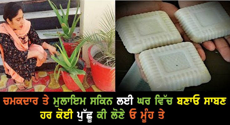 ਵੀਡੀਓ ਥੱਲੇ ਜਾ ਕੇ ਦੇਖੋ,ਚਮਕਦਾਰ ਅਤੇ ਮੁਲਾਇਮ ਤਿੰਨ ਘਰ ਵਿਚ ਬਣਾਓ ਸਾਬਣ ।ਅੱਜ ਤੁਹਾਨੂੰ ਅਸੀਂ ਇਕ ਸਾਬਣ ਬਣਾਉਣਾ ਦੱਸਾਂਗੇ ਜੋ ਸਰਦੀਆਂ ਦੇ ਮੌਸਮ ਵਿੱਚ ਕਾਫੀ ਫਾਇਦੇਮੰਦ ਹੋਵੇਗੀ।ਬਹੁਤ ਸਾਰੇ ਸਾਬਣ ਇਹੋ ਜਿਹੇ ਹੁੰਦੇ ਹਨ ਜੋ ਸਾਡੀ ਸਕਿਨ ਨੂੰ ਰੁੱਖਾਂ ਬਣਾ ਦਿੰਦੇ ਹਨ। ਇਹ ਸਾਂਬਣ ਤੁਹਾਡੀ ਸਕਿਨ ਨੂੰ ਬ੍ਰਾਈਟ ਤੇ ਮੁਲਾਇਮ ਕਰੇਗਾ। ਇਸ ਸਾਬਣ ਨੂੰ ਬਣਾਉਣ ਲਈ ਤੁਹਾਨੂੰ ਚਾਹੀਦਾ ਹੈ ਐਲੋਵੇਰਾ।ਸਾਨੂੰ ਤਾਂਜੇ ਐਲੋਵੇਰਾ ਦੀ ਜ਼ਰੂਰਤ ਪਵੇਗੀ ਐਲੋਵੀਰਾ ਨੂੰ ਚੰਗੀ ਤਰ੍ਹਾਂ ਧੋ ਕੇ ਸਾਫ ਕਰ ਲਵੋ।ਐਲੋਵੇਰਾ ਸਾਡੀ ਸਕਿਨ ਲਈ ਬਹੁਤ ਹੀ ਵਧੀਆ ਚੀਜ਼ ਹੈ ਇਹ ਵਾਲਾਂ ਲਈ ਵੀ ਬਹੁਤ ਵਧੀਆ ਚੀਜ਼ ਹੈ।