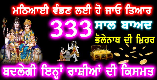 333 ਸਾਲ ਬਾਅਦ ਭੋਲੇਨਾਥ ਦੀ ਕਿਰਪਾ ਹੋ ਰਹੀ ਹੈ। ਇਹ 6 ਰਾਸ਼ੀਆਂ ਇਸ ਮਹੀਨੇ ‘ਚ ਸਭ ਤੋਂ ਖੁਸ਼ਕਿਸਮਤ ਰਹਿਣਗੀਆਂ ਕਿਉਂਕਿ ਇਨ੍ਹਾਂ ਲੋਕਾਂ ਨੂੰ ਮਹਾਦੇਵ ਭੋਲੇਨਾਥ ਦਾ ਖਾਸ ਆਸ਼ੀਰਵਾਦ ਮਿਲ ਰਿਹਾ ਹੈ। ਆਓ ਜਾਣਦੇ ਹਾਂ ਇਹ ਕਿਹੜੀਆਂ ਖੁਸ਼ਕਿਸਮਤ ਰਾਸ਼ੀਆਂ ਹਨ ਜਿਨ੍ਹਾਂ ‘ਤੇ ਮਹਾਦੇਵ ਭੋਲੇਨਾਥ 333 ਸਾਲ ਬਾਅਦ ਖੁਸ਼ ਹੋ ਕੇ ਆਪਣੀ ਬੰਦ ਕਿਸਮਤ ਦਾ ਤਾਲਾ ਖੋਲ੍ਹ ਰਹੇ ਹਨ-ਆਉਣ ਵਾਲਾ ਸਮਾਂ ਤੁਹਾਡੇ ਲਈ ਬਹੁਤ ਸ਼ੁਭ ਫਲ ਦੇਣ ਵਾਲਾ ਹੈ।